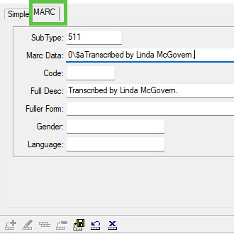 Instead of going to the MARC tab and entering, for example: "=511 0\$aTranscribed by Linda McGovern." for every record, you can set things up so that the transcriber's name in the narrator heading field will be saved to the 511 tag (instead of the default 508 tag).